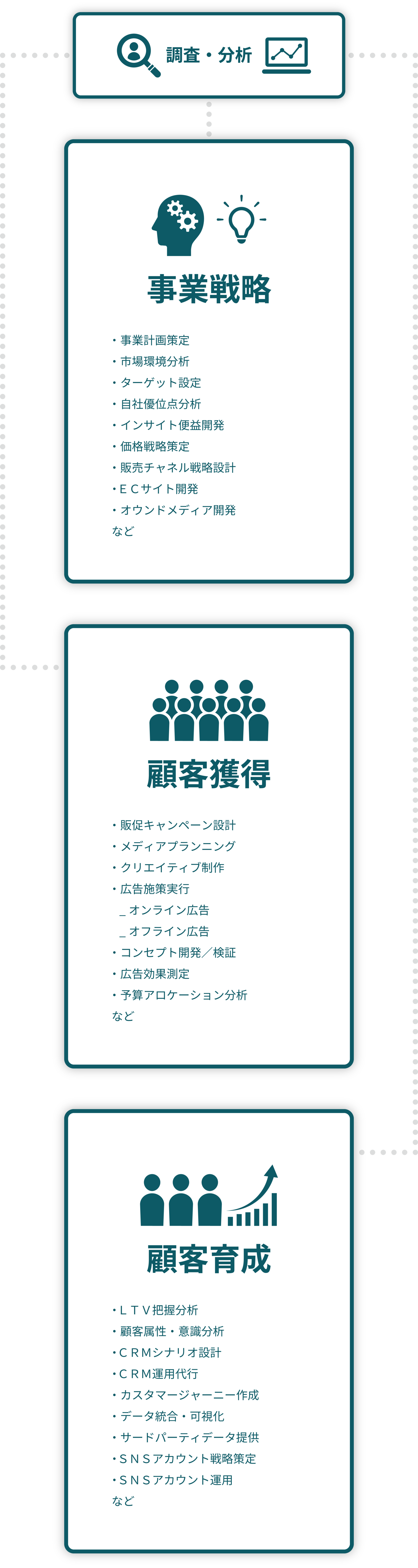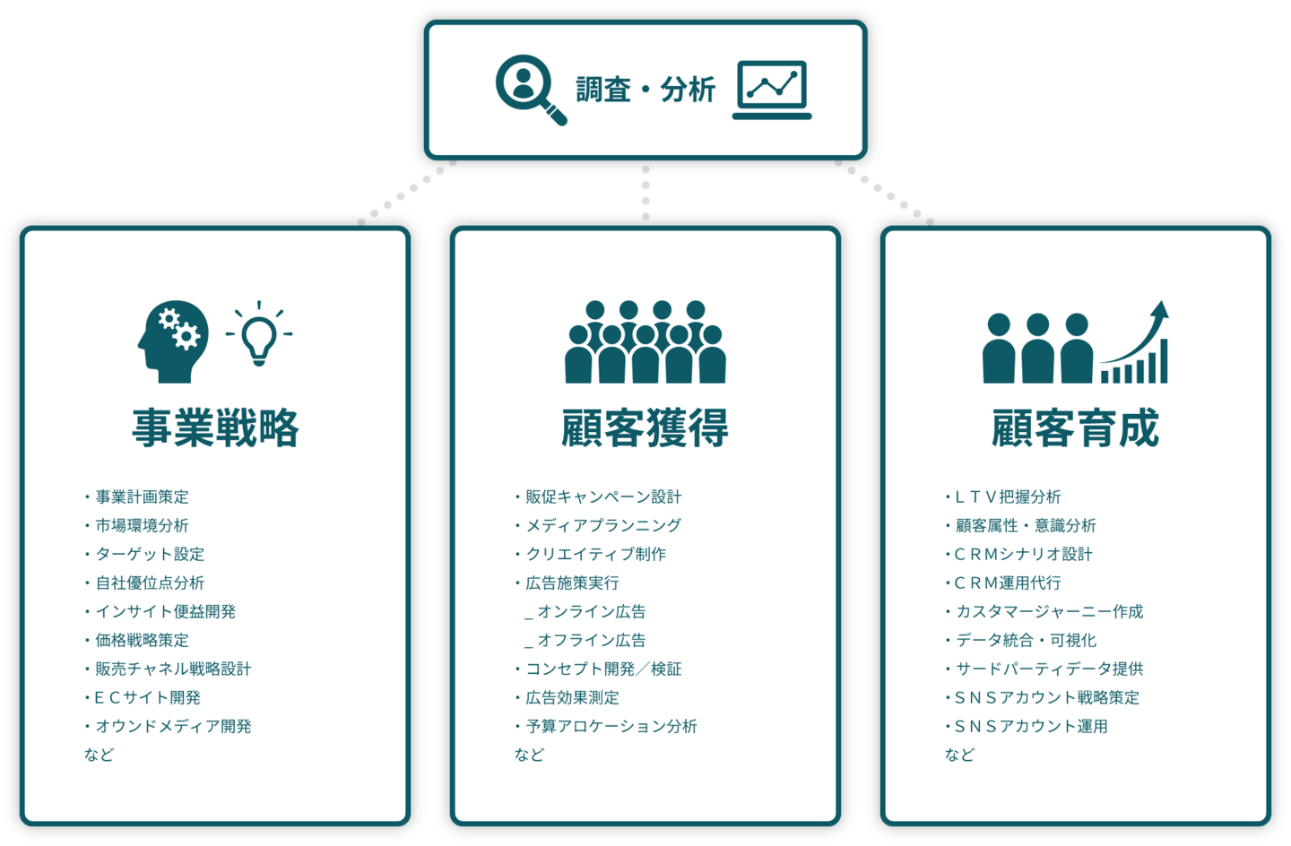 消費者の意見、行動データを軸にした広告、デジタルマーケティング施策、CRM施策、効果測定が可能となります。