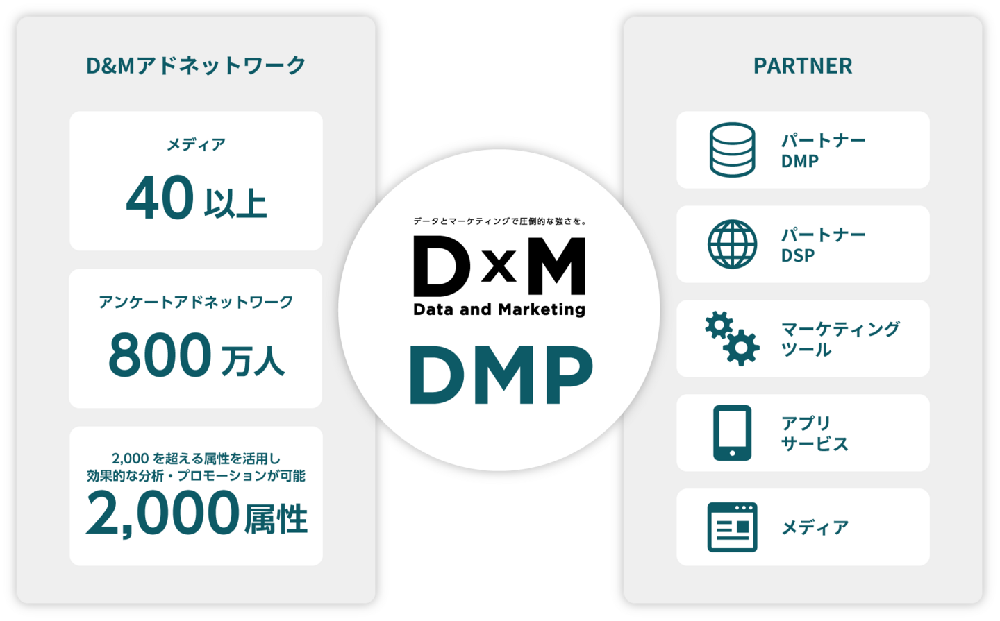 DMPは、DSPやメディア、アプリサービスなど様々なパートナーと連携しており、意識や行動ログデータを保有。