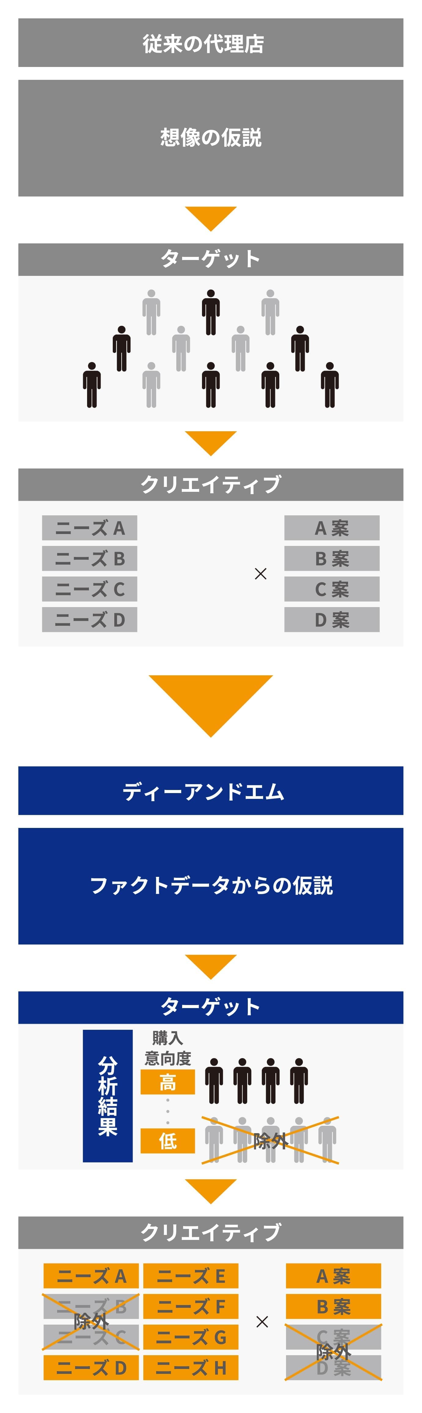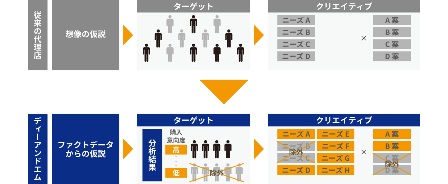 ターゲットに響く訴求とは、「求めること」と「それを解決できる訴求ポイント」がきちんと組合せになっていることが大切です。ディーアンドエム社は、この「求めること」と「それを解決できる訴求ポイント」の組合せを事前に調査を用いて検証します。これにより、必要のない訴求を特定しクリエイティブABテストの無駄を省きます。