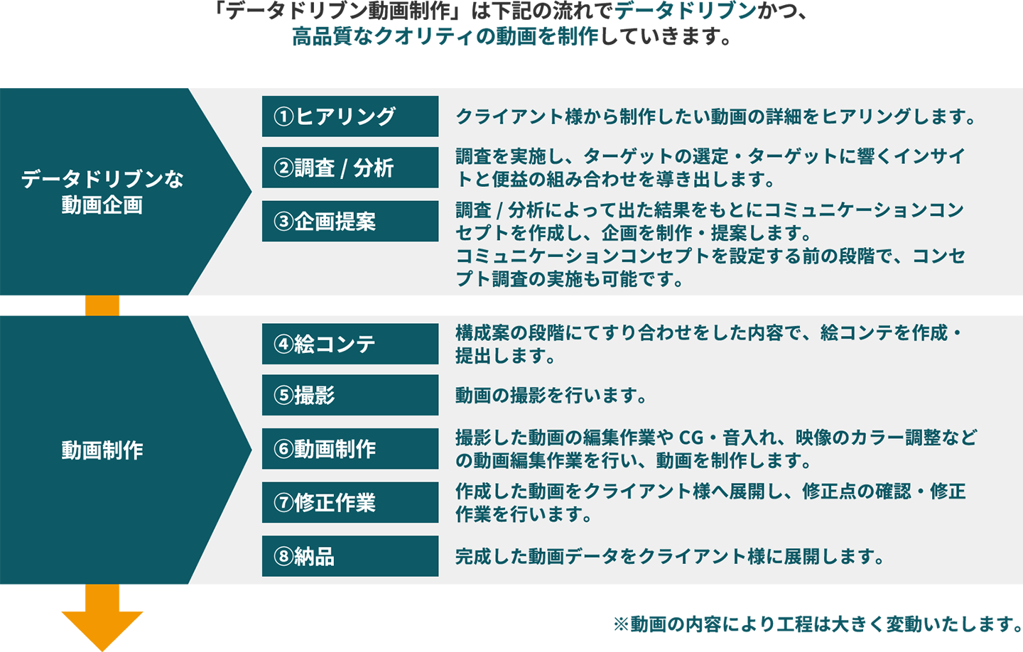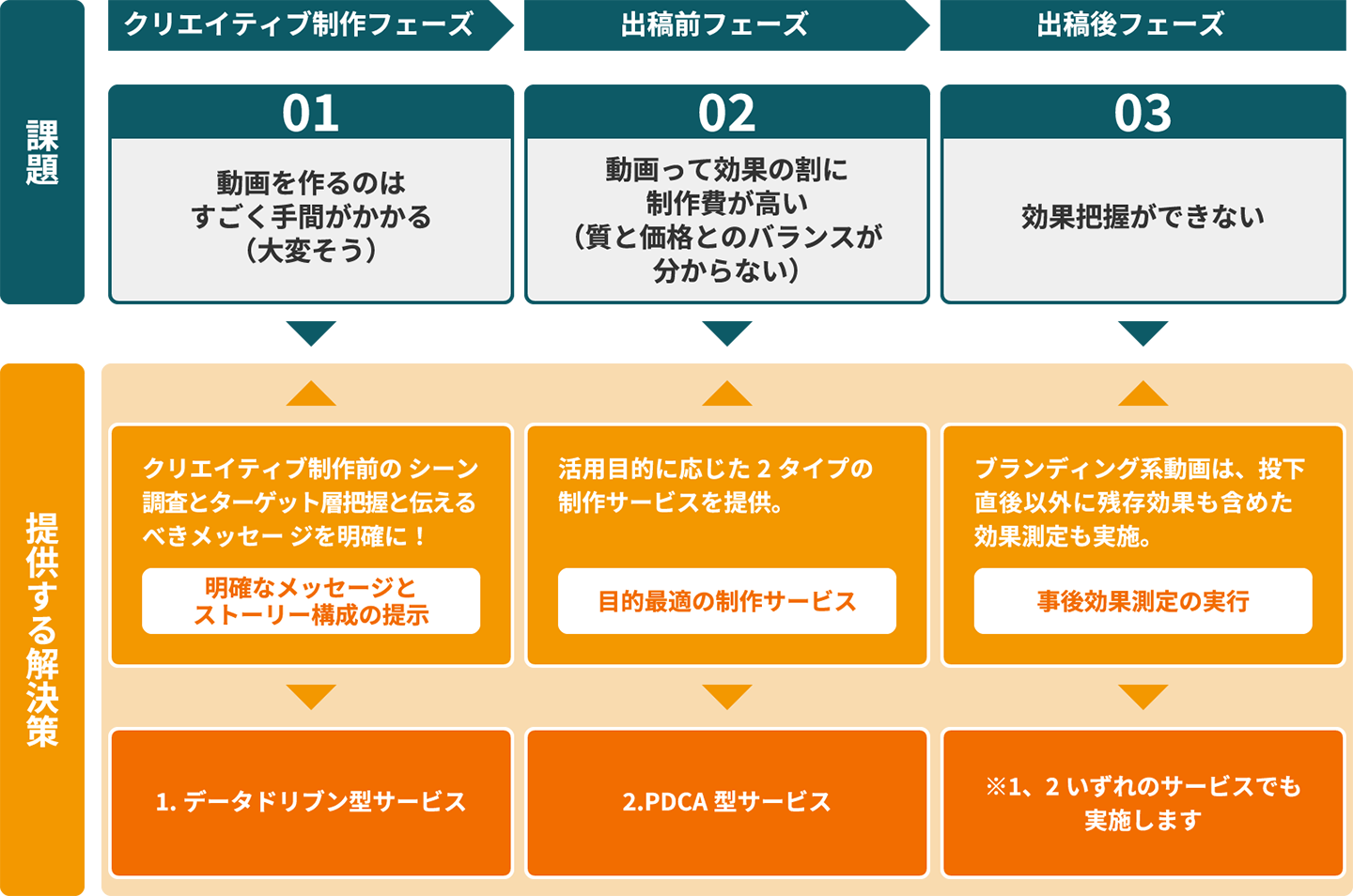 制作目的に応じた2タイプの動画制作サービスを提供しています。主にブランディング目的で、TVCMやコーポレートサイト掲載動画等に対応する「データドリブン型」と、時間とコストを抑えて作りたい場合で、短期間でクリエイティブをブラッシュアップする、社内向け説明動画等に対応する「PDCA型」。