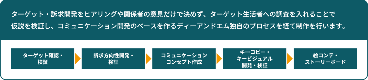 マーケットやターゲットを設定するために、事前にターゲット層を明確にし、そのターゲットに響く訴求の方向性を立て→検証調査を経た上で、コミュニケーションコンセプト開発をしていく戦略的な制作を行うのが特徴です。
