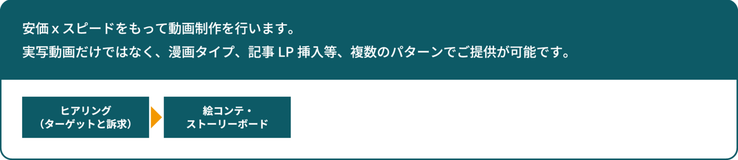 時間とコストを抑えてリーズナブルに作りたいが、クオリティもキープしたいというニーズにこたえるサービスです。ヒアリングさせていただいた目的・ターゲット・訴求内容に基づき、短時間で絵コンテ提示をし、制作に進みます。